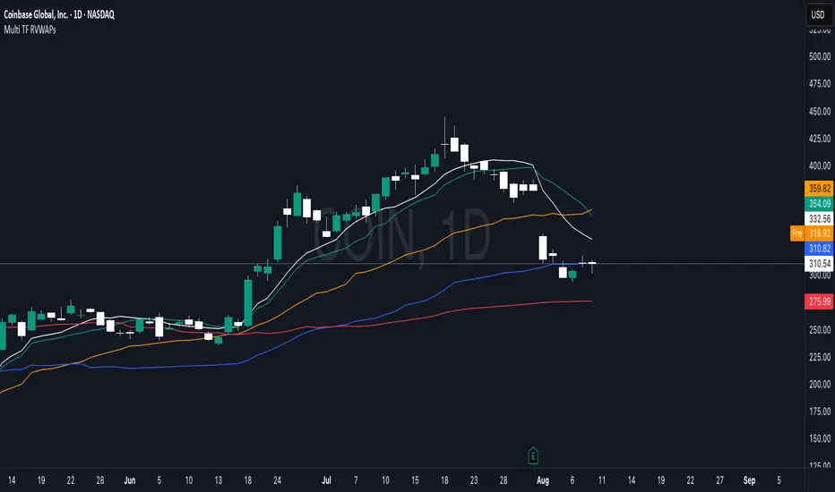 This indicator plots up to five customizable time-based Rolling Volume-Weighted Average Price (RVWAP) lines.