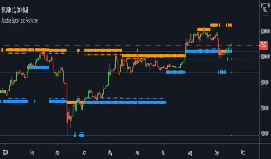 It will plot local support and resistance in red and green, then override them with blue when they are active as support, and orange when they are active as resistance.