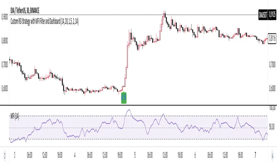 Description: This Pine Script is a custom trading strategy that combines the power of the RSI (Relative Strength Index) and MFI (Money Flow Index) indicators with additional signal filters and a user-friendly dashboard. The strategy is designed to identify potential entry and exit points based on dynamic conditions, providing an advanced approach to technical analysis and decision-making in trading.