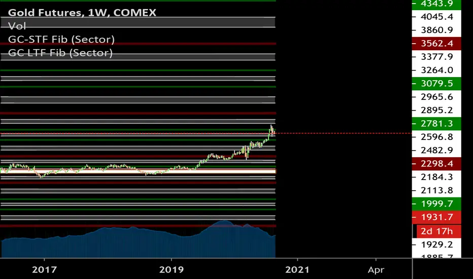Let's bring GOLD to life here! Tis the season...like always for gold. This is a Longer Time Frame Fib level indicator. To be used with Longer Time frame Indicator. Though it can be used independently. It shows where the market is looking to go and where it has been. When the market get above one level ( white bar, for example) look for price action to continue to the next level (white bar). If it breaks below the white bar look for price action to go the next level below for support. It is fractal in nature. It is fib levels inside longer time frame fib levels. I hope it will impress! More importantly I hope you can make some money! It is great for having targets and support levels. It helps in knowing why the market may continue in a direction. For example: When the price action has already moved up, why does it keep going up, because it hasn't reached targeted fib level, yet. Same reason price action may move lower once it breaks a particular level. It is looking for its fib level support. I will add this as well. the third white bar is a reversal bar. If it breaks the top it wants to continue onward. The first white bar is a pullback bar to the bar below that is between the green bars (unless market is actively riding the 8 sma)
