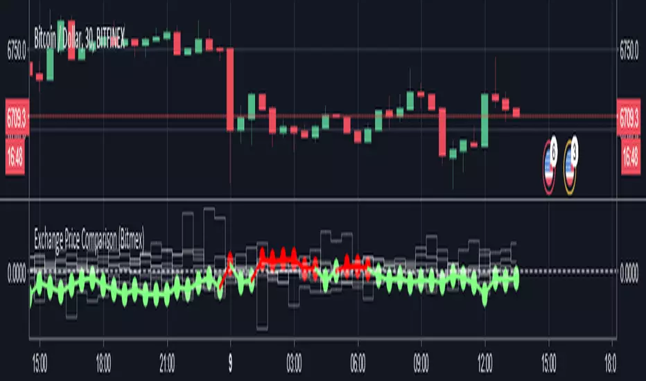 Average price across 8 exchanges is the 0 line, with your selected exchange displayed green if it's below the average price, red if it's above the average price. Values are displayed as distance from the average, positive or negative.