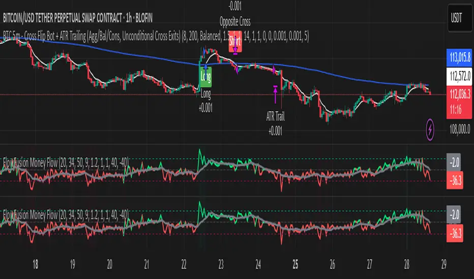 Original money-flow oscillator combining Flow Pressure, Rolling VWAP Drift, and PVT Momentum into one normalized score (−100..+100) with a signal line, thresholds, optional component plots, and ready-made alerts.