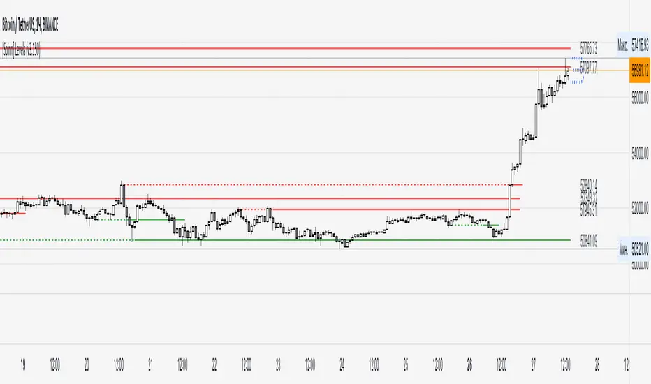 The main challenge in creating a levels indicator is ensuring only significant, key levels are displayed, avoiding clutter. This indicator achieves this by selectively filtering important levels from the noise and visually distinguishing confirmed levels (solid lines for tested or price-near levels) from unconfirmed (dashed lines for less important ones).