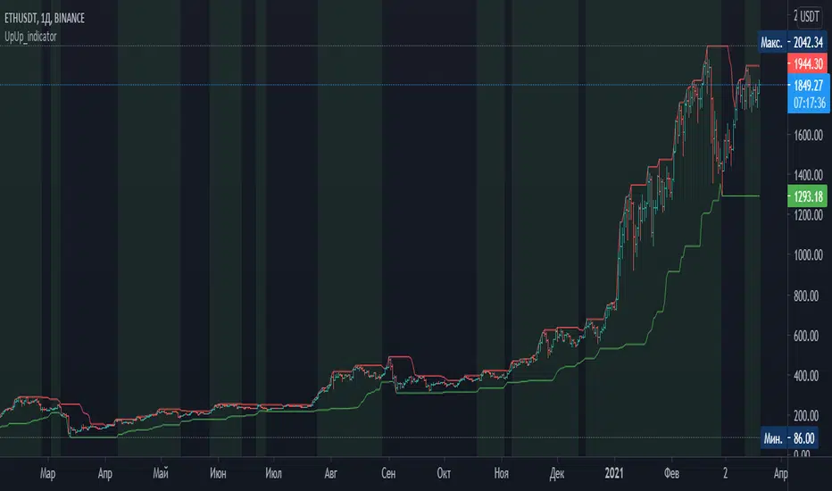 This indicator is a trend indicator and is designed for trading on long positions. "High period" is the line of maxima for the entered period. "Lows period" is the line of lows for the entered period. "Number of ascent" is the total number of times the "High period" and "Low period" exceed their previous values. At the moment when the "High period " and "Lows period" begin to rise, the counter is turned on, which counts these increases, at the moment when the value of the counter exceeds the value of "Number of ascents" there is a signal to open a long position. When one of the values ("High period "or" Low period") becomes less than its previous value, the counter is reset and the position is closed.