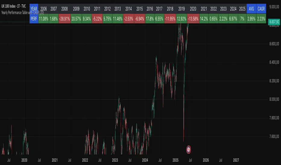 This Pine Script indicator provides a clear table displaying the annual performance of an asset, along with two different average metrics: the arithmetic mean and the geometric mean (CAGR).