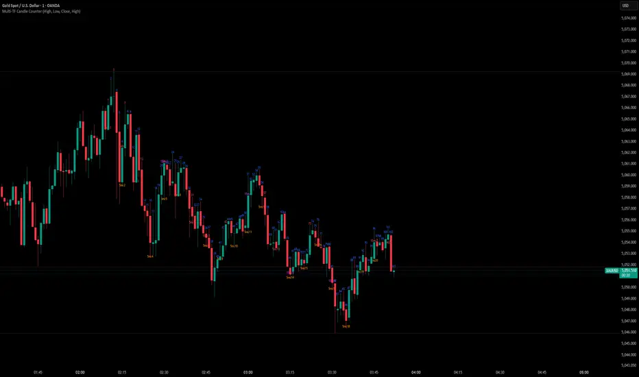 Note: This indicator works on any timeframe but is most effective on lower timeframes (1m, 5m, 15m) when tracking higher timeframe counts.