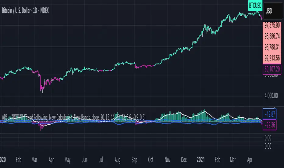 - Visualization: Plots the adaptive RSI as color-coded columns, with colors indicating bullish or bearish momentum. The dynamic bands are filled to visually represent overbought and oversold zones.