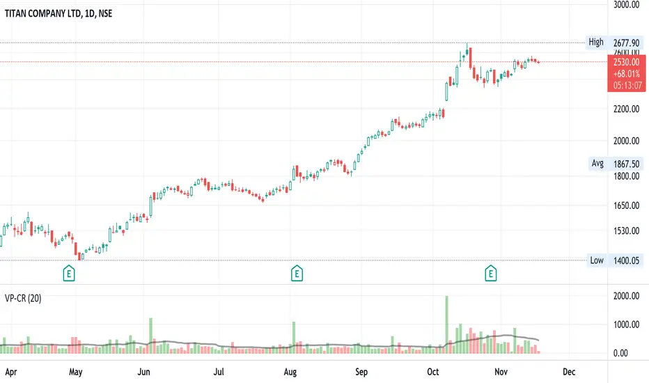 On 10/NOV/21 - In the chart displayed here, Titan volumes are on average quite substantial as one can see. The 20 day moving average is 550 CR+. 10/NOV volumes are shown as 226 CR and the RVOL is 0.41 (226/550).