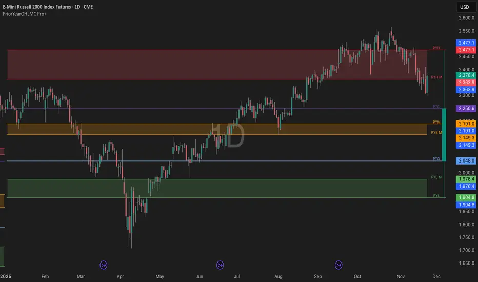 • Full prior-year candle rendered in the right margin for immediate yearly bias and range reference