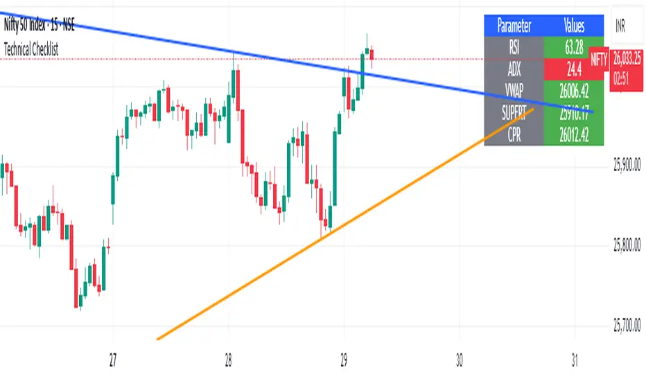 Basic Checklist table for bullish condition checks for ADX, RSI, VWAP , CPR, Supertrend