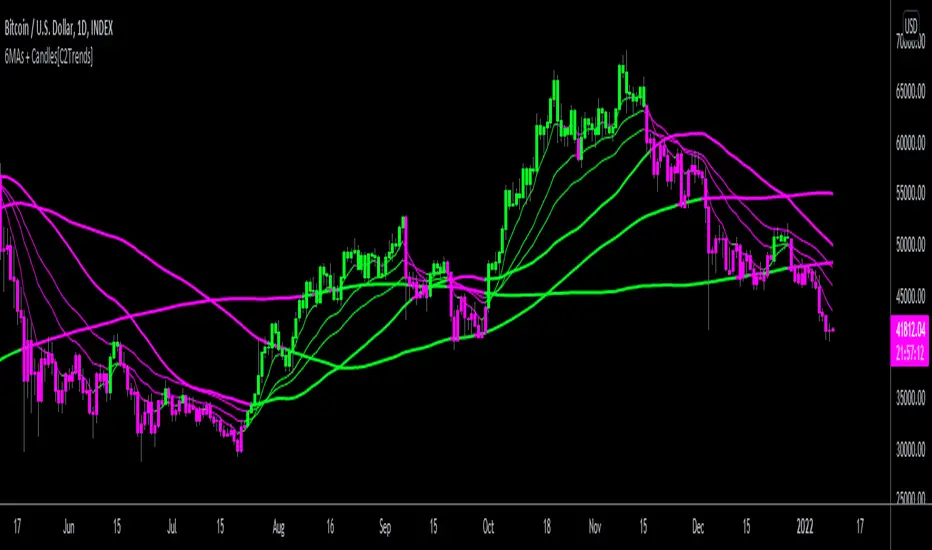 // 1) 'Candle EMA' input is the trend lookback period for the price candle colors. When price is above desired Candle EMA, price candles will color green. When price is below the Candle EMA, price candles will color fuchsia.