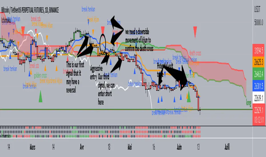 This indicator display three categories of signals that are given by the Ichimoku indicator: