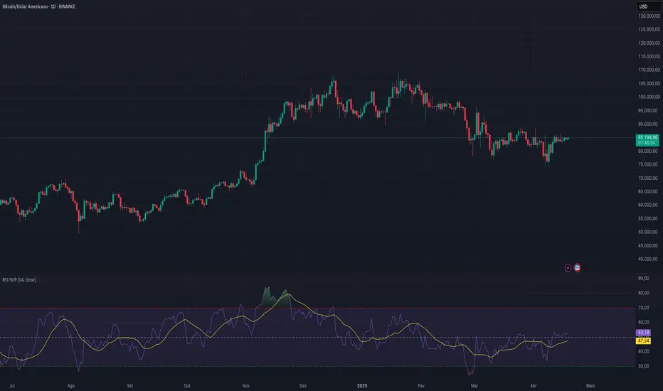 - RSI Levels: The RSI line (purple) oscillates between 0 and 100. Levels above 70 (red band) indicate overbought conditions, while levels below 30 (green band) indicate oversold conditions. The 50 level (white band) is neutral.