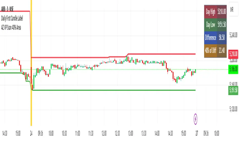 This indicator is developed by Ankur Zaveri, Gujarat, India. This indicator marks the Day's High and Day's Low for the underlying and calculates the difference between the two extrme values of the day in a separate table on the chart. It also shows 40% value of the difference between the Day's High and Day's Low to help scan the underlyings for taking trades based on Volume Profile.