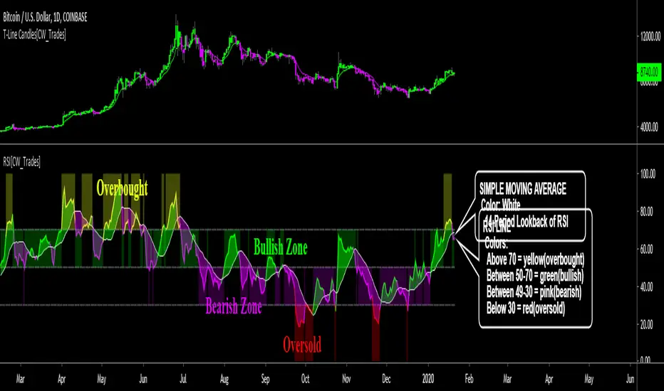-This simple moving average(SMA) is set to a lookback period of 14 and is plotted as a white line. As the RSI moves above and below the SMA the color of the RSI changes; when above the SMA the RSI is lime, when below he SMA the RSI is pink. Lime indicates bullish momentum for RSI, pink indicates bearish momentum for RSI.