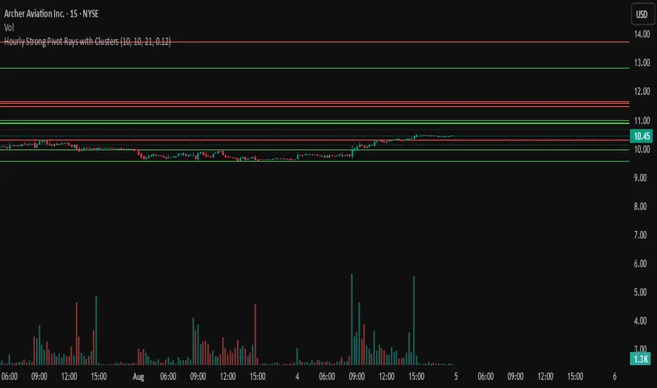 Hourly pivots with areas of confluence clusters. Works best with strong stocks and indexes.