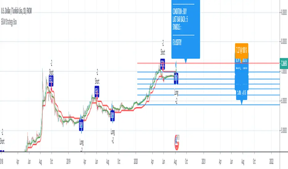 “E&M Strategy Box” is an indicator created to combine different strategies. Different strategies are planned to be added in the future.