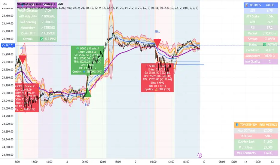 MNQ TopStep 50K | Ultra Quality v3.0 - Publish Summary📊 OverviewA professional-grade trading indicator designed specifically for MNQ futures traders using TopStep funded accounts. Combines 7 technical confirmations with 5 advanced safety filters to deliver high-quality trade signals while managing drawdown risk.🎯 Key FeaturesCore Signal System