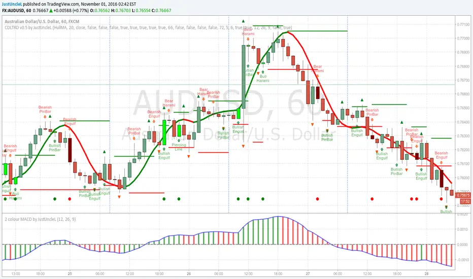 The highlighted candles (maroon and darker green) represent the defined PA patterns that have been confirmed following the current trend direction that is indicated by the Hull MA(20) line (can select a different type of MA, or even disable) and confirmed by MACD direction (can be disabled). The confirmed Alerts are indication by green (buy) and red (sell) dots at the bottom of the chart. An alert is generated from this selection for the alert condition of the alarming system.