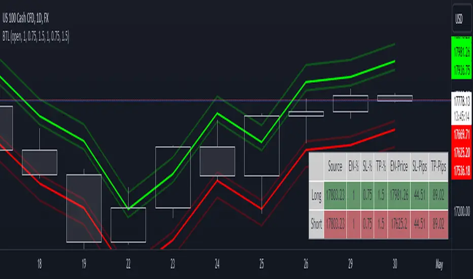 This indicator is designed for trading CFD indices, focusing specifically on breakout strategies.For instance, utilize this indicator to set up a bracket order at the beginning of the trading day, anticipating a breakout in NAS100 with a movement of 1% in either direction. Utilizing the Open Price, it calculates the Entry Price, Stop Loss (SL), and Take Profit (TP) based on percentage movements.