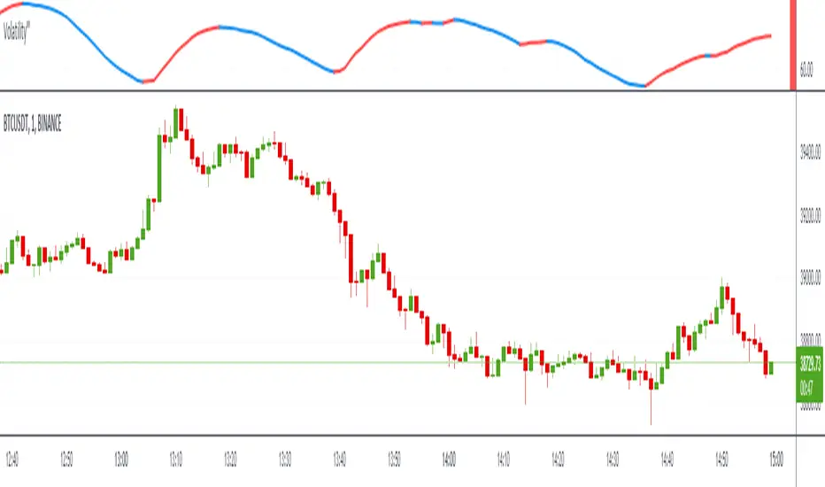 When the indicator color is red the market tends to move fast and with volume. The distance between the volatility colored and the black moving average lines gives you a hint of the volatility direction.