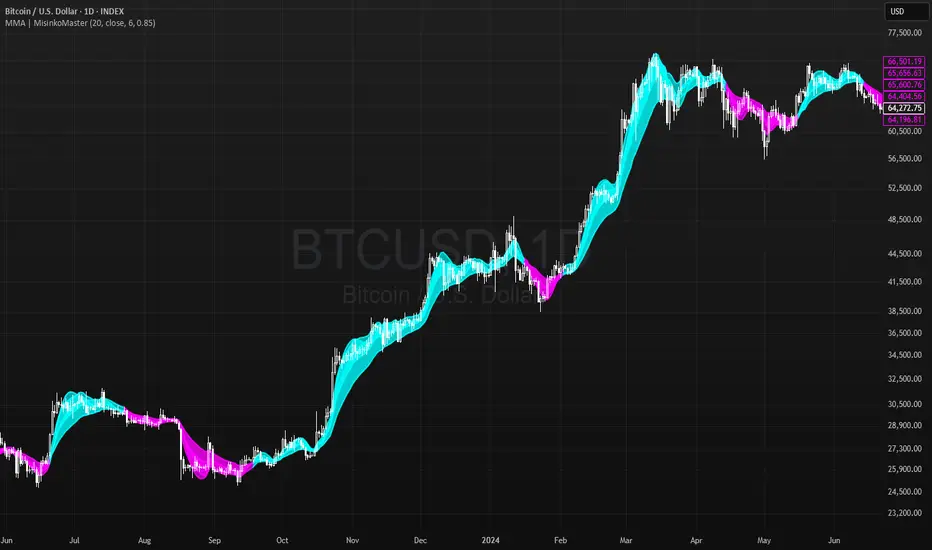 By comparing faster, more adaptive moving averages (DEMA, TEMA, ALMA, HMA) against a baseline EMA, the MMA produces a cumulative score that reflects the prevailing strength and direction of the trend.