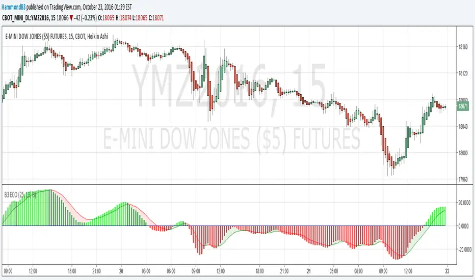 Blau's Ergodic Candlestick Oscillator = a decent trend finder, however slightly lagged. It can help you to see a reversal entry if you are looking for one. I find the one line ECO hard to use, so I have created this histogram version with a signal line. The colors help to show you whats going on with the ECO and its bias. This indicator shows up in a couple books by people other than Blau, and namely by Krausz. You can also see divergences, for example in pic above the lower or second of the two green humps showing that the general uptrend might be weakened as this run contained less momentum. Tighten up the signal line to see a faster change in its color. These settings are the B3 input settings for default, meaning the ones I use in trading. They are not however the default values you might read about other places.