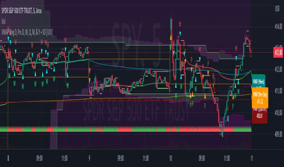 In today's dynamic and fast-paced financial markets, traders require versatile and powerful tools that can help them navigate the complex world of trading. The "VWAP Xing D, Prv.D, W, Q, M, & Y + SD" indicator is designed to be the ultimate, all-in-one solution for traders seeking a comprehensive and robust trading indicator. This cutting-edge tool combines the power of an extensive VWAP library with the versatility of Bollinger Bands, Donchian Channels, standard deviation multi-timeframe analysis, and an auto boxed range identifier, all to provide traders with the crucial insights needed to identify reversals, breakdowns, and breakups.