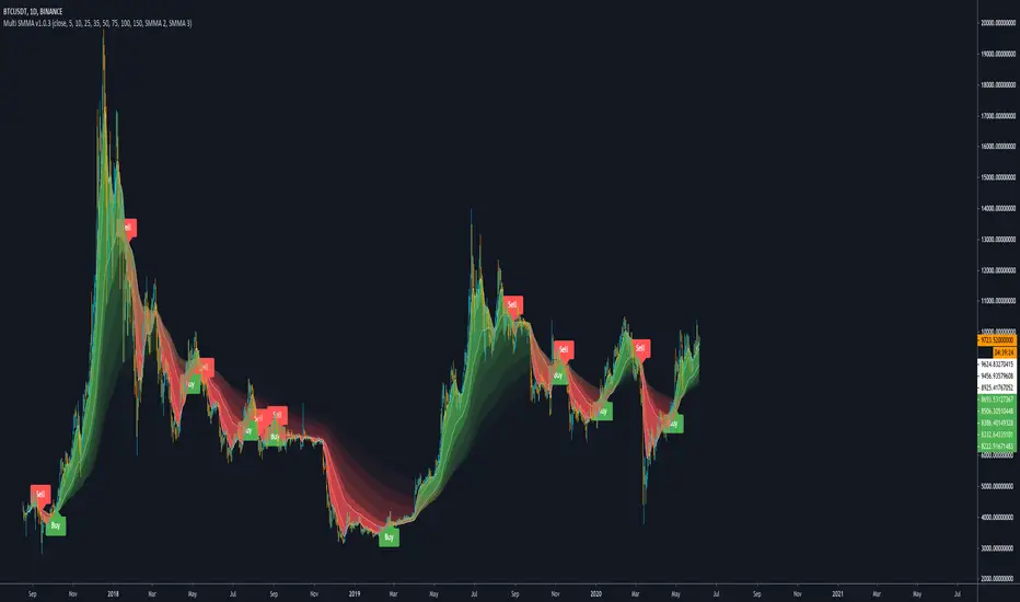 An indicator that shows multiple Smoothed Moving Averages, with buy/sell signals on the second and third moving averages crosses