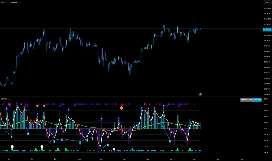 Appendix: ZenAlgo - Q – In-Depth Methodology and StructureZenAlgo - Q is designed to visualize momentum changes and divergences using two RSI calculations, dynamic bands, and a histogram. The combination of these components provides a structured way to interpret price behavior.