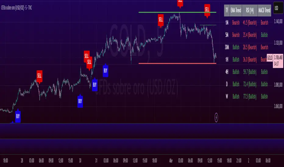 The script displays a table in the top-right corner of the chart with indicators like the EMA trend, RSI value, and MACD histogram for timeframes of 1 minute, 5 minutes, 30 minutes, 1 hour, 4 hours, daily, and weekly.