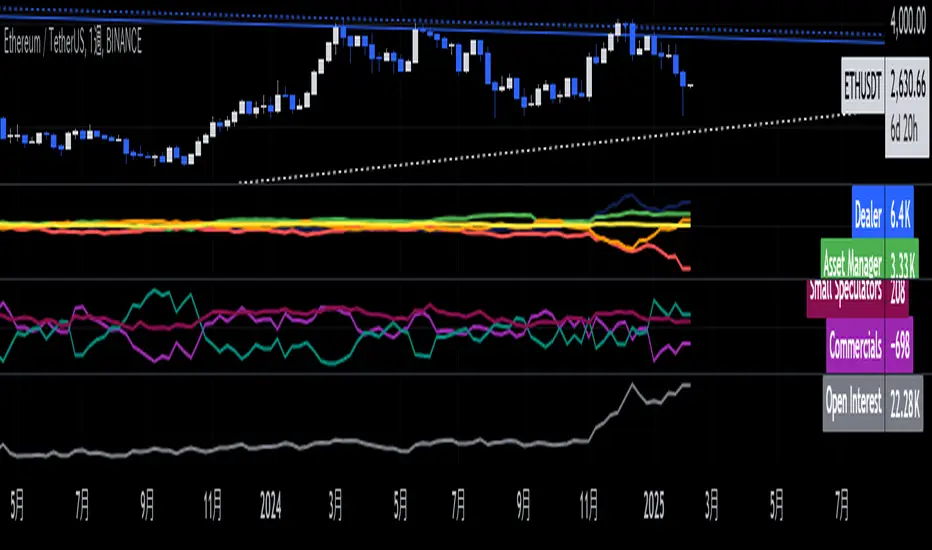 Ethereum COT [SAKANE] is an indicator that visualizes Ethereum futures market positions based on the Commitment of Traders (COT) report provided by the CFTC (Commodity Futures Trading Commission).