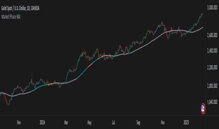 Market Phase MA is an advanced trend-following indicator designed to provide traders with a dynamically colored moving average that adapts to market conditions. It uses a powerful combination of Average True Range (ATR) and Average Directional Index (ADX) to classify market trends in real-time. The indicator integrates a fully customizable moving average (SMA or EMA) to highlight trend phases clearly and effectively.