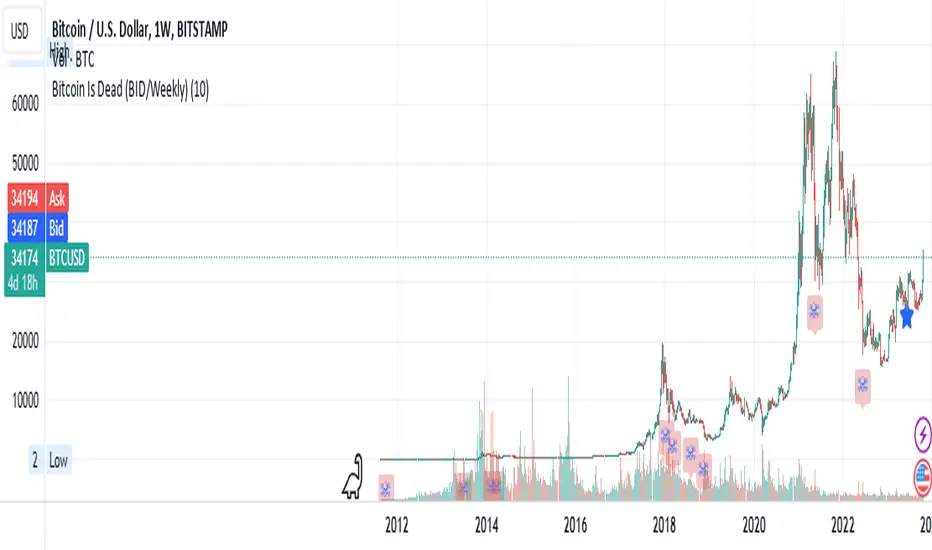 Suggested usage: set the drop % and apply to weekly charts. Can be used on any chart, not just Bitcoin, but calculates indicator specifically for Bitcoin pricing.