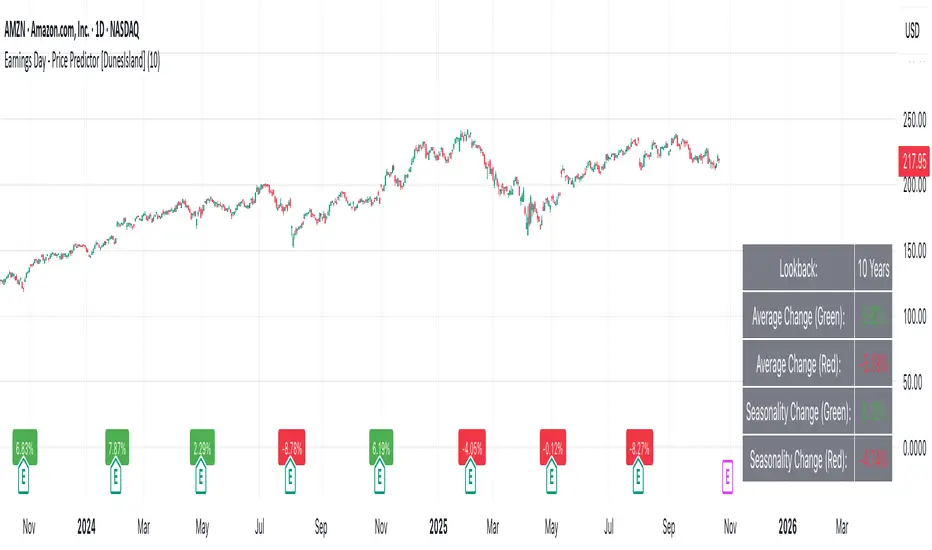 This indicator helps traders assess a stock's historical reaction to earnings announcements. The overall averages give a broad sense of typical gains/losses, while the seasonality focuses on quarter-specific trends to "predict" potential movement for the upcoming earnings (based on past same-quarter performance). It's best used on daily charts for stocks with reliable earnings data. Note that quarter inference is calendar-based and may not perfectly match fiscal calendars for all companies—it's an approximation.