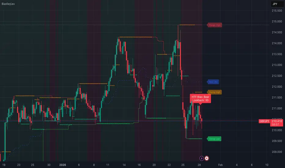 Range EQ Bias & Levels is a clean, non-repainting higher-timeframe overlay tool designed to help traders align lower-timeframe decisions with broader market context.