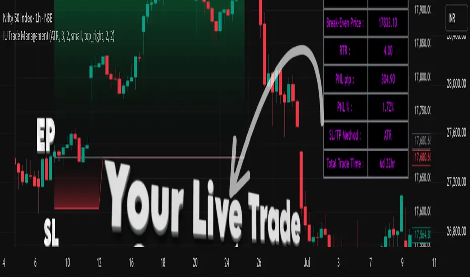 IU Trade Management is a powerful utility tool designed to help traders manage their trades with precision and clarity. It provides automated Stop Loss, Take Profit, and Break Even calculations using multiple customizable methods. Along with clear SL/TP plotting on the chart, it also displays a detailed trade status table that tracks every important detail including entry price, SL/TP levels, break-even, PNL, and trade duration. This tool is perfect for traders who want to manage risk and rewards visually and systematically.