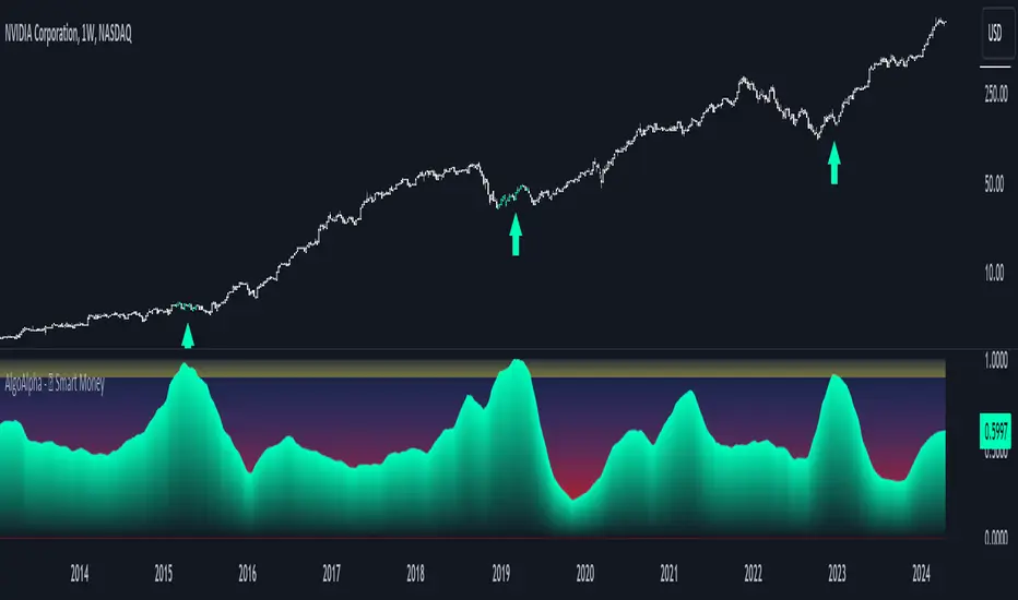 The Smart Money Interest Index by AlgoAlpha provides a unique metric that contrasts the investment behaviors of informed (smart money) and general (dumb money) investors. Utilizing the Relative Strength Index (RSI), this indicator evaluates the trading pressure exerted by both groups over specified periods, then forms a ratio of these activities to identify dominance in buying or selling trends. For example, when we see dumb money selling and smart buying, this suggests that the conditions for buying the asset is optimal as smart money is willing to buy the dip. The outputs are normalized against the highest values observed in a user-defined term to maintain consistency through varying market conditions. When the index exceeds a certain threshold, it suggests that smart money presence is particularly strong, possibly indicating that smart money is looking to enter positions on the asset. This tool serves as a sophisticated visual guide to understanding market dynamics and making well-informed trading decisions based on the activities of market-savvy investors. Smart money activity is identified during areas of low volume and the opposite for dumb money, the indicator uses the NVI and PVI metrics as its foundation for smart and dumb money analysis.