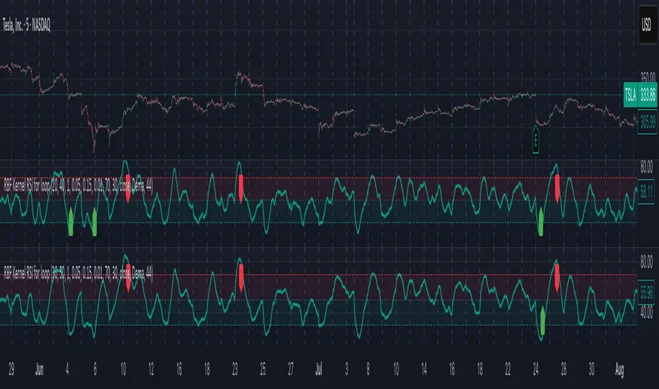 An RSI-style oscillator that uses a radial basis function (RBF) kernel to compute a similarity-weighted average of gains and losses across many lookback lengths and kernel widths (γ). By averaging dozens of RSI estimates—each built with different parameters—it aims to deliver a smoother, more robust momentum signal that adapts to changing market conditions.