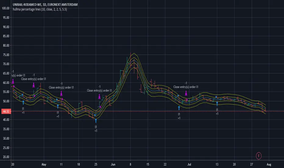 The bands percentage and hullMA length can be adjusted to see how the trading strategy performs.