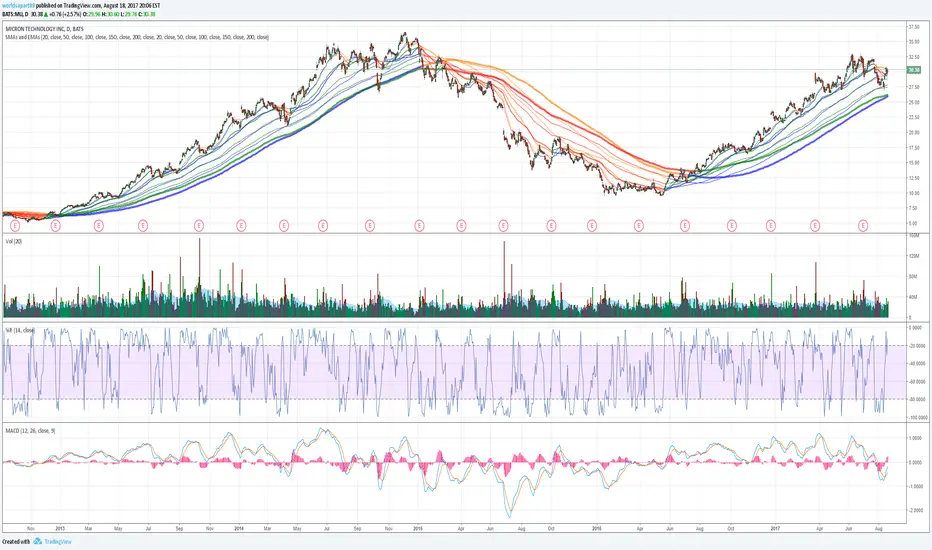 This script graphs 5 SMAs (20, 50, 100, 150, 200) and 5 EMAs (20, 50, 100, 150, 200). The first group uses blue and orange colors whereas the second one uses green and red. When a bar closes below a moving average, either orange or red will be used depending on which type of moving average and which period. In bullish mode, we show blue and green. Moving average periods are configurable, and you can hide the MAs you don't want.