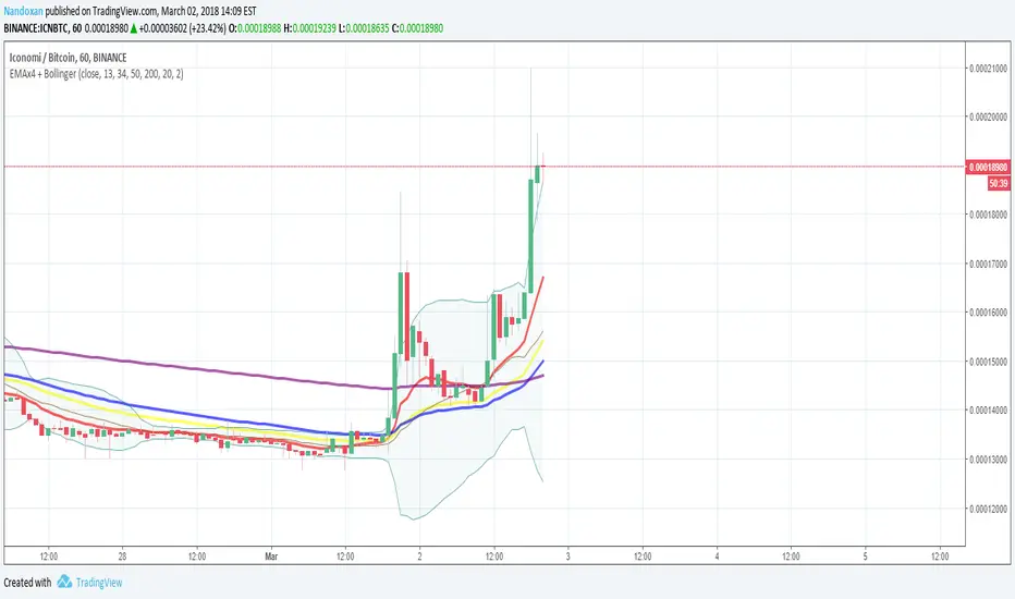 El indicador incluye 4 EMAs (de 14, 34, 50 y 200) y Bandas de Bollinger