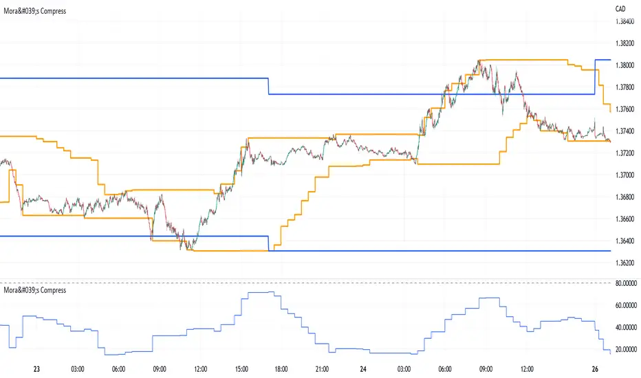 The indicator is scaled such that values near zero mean price is compressed and values near 100 price is over-extended. The indicators is designed to allow different time-frames, while avoiding repainting.