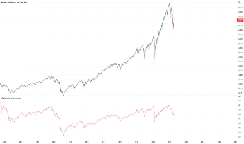 Plots current ticker / M2 money supply, to give an idea of 'inflation adjusted performance'.