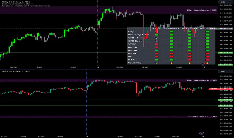 - Range Breakout 1st 5min Candle (ORB): Opening Range Breakout levels are calculated and compared with current close prices, detecting breakout/breakdown conditions.