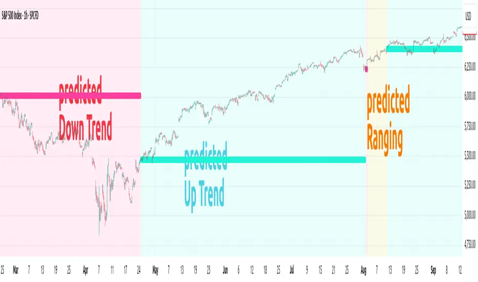 Internally is a collection of nine artificial neural networks (ANNs) trained on the S&P 500 to forecast uptrends, downtrends, or ranging markets. Each ANN is trained on one of the following timeframes: 1m, 2m, 3m, 5m, 10m, 15m, 30m, 45m, and 60m, and the appropriate model is selected automatically.