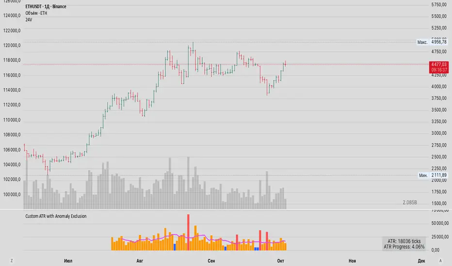 Description in EnglishThis Pine Script indicator, named "Custom ATR with Anomaly Exclusion", is designed to analyze volatility with a unique approach: it calculates the average range (similar to ATR) by excluding abnormally large and small bars. This provides a cleaner view of an instrument's normal, day-to-day volatility, unskewed by sudden spikes or periods of extreme calm.