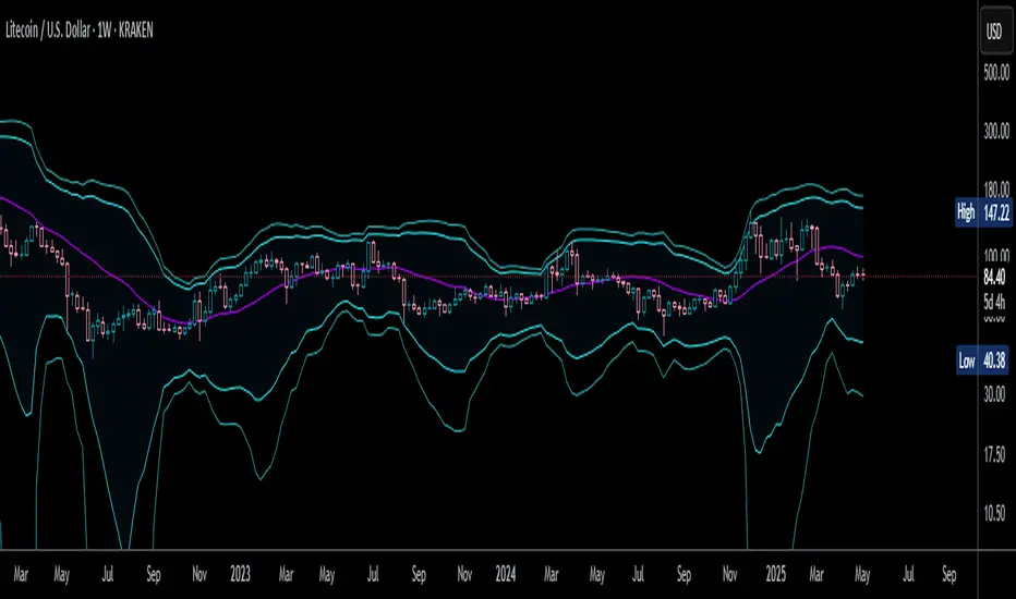 Dual Bollinger Bands: Plots both standard and outer bands around a configurable moving average, allowing visualization of typical and extreme volatility ranges.