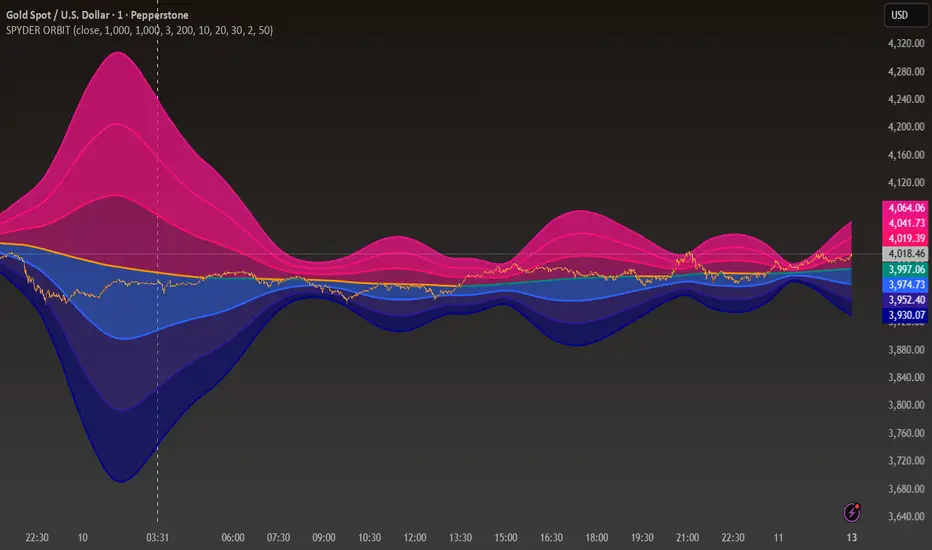 Around this smoothed orbit, SPYDER ORBIT adds multi-level deviation envelopes (1σ, 2σ, 3σ) to visualize volatility expansion and contraction zones. These act like adaptive shells, helping identify exhaustion, breakout volatility, and mean-reversion opportunities.