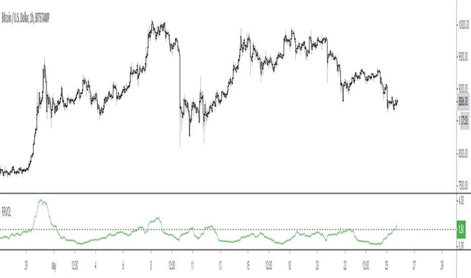 This script sums the volume for the selected period and compares it to the selected period before that. It works on a rolling basis, so it is suitable for 24/7 markets such as crypto. That is the main difference between this and the regular RVOL indicator. Of course lower timeframes can also be selected for comparing changes in volume, but you should be aware how the times when markets are closed affect the calculation. For example, if used on stocks, the indicator will use the data that is available, meaning that the amount of data needed to calculate daily cumulative volume can be stretched out over a few days. If the stock session is 8 hours long, that comes out to 3 days.